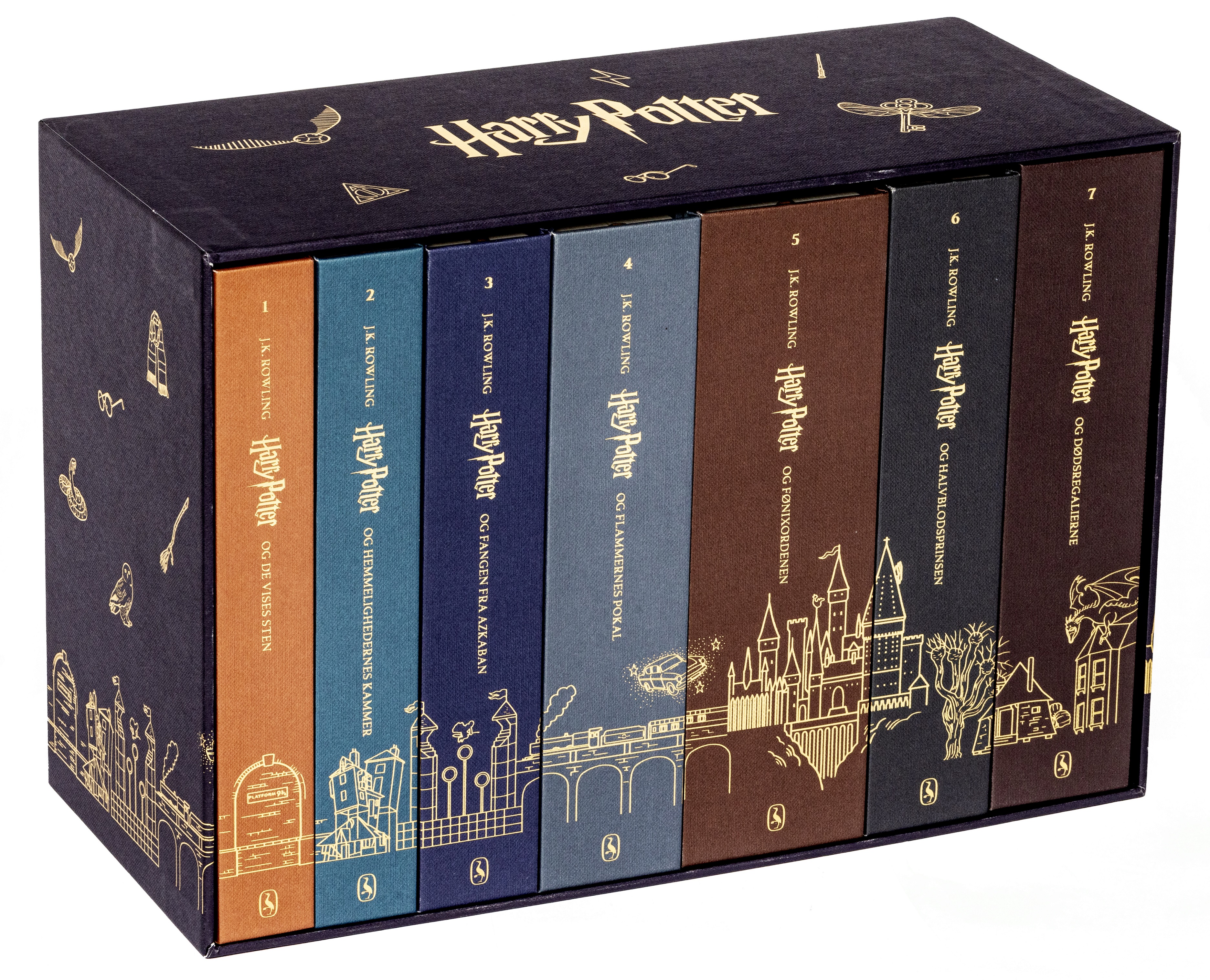 Dette eksklusive jubilæumsbokssæt med alle syv bøger i Harry Potter-serien fejrer vi de første danske udgaver, og det er derfor selvfølgelig Per O. Jørgensens ikoniske illustrationer, der pryder omslagene.
